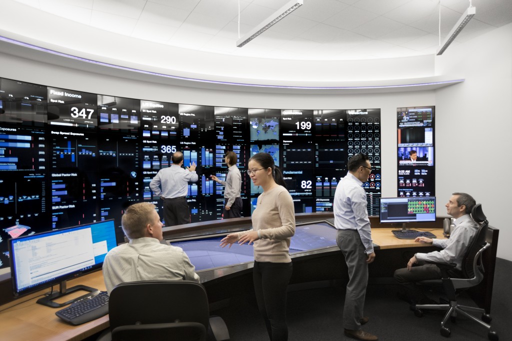 Platinum Funds Invest Risk Management Center provides a comprehensive view of the various investment portfolios and how they fit within pre-established guidelines. Built in 2014, its front-end consists of a 27' by 8' interactive touchscreen designed to visualize data in ways that allow for rapid comprehension. Its back-end systems, which connect to every Platinum Funds Invest office worldwide, continuously run a wide range of operational readiness, risk, and stress test monitors.